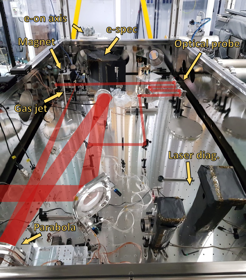 Figure 5: The LWFA experimental setup in VE1 chamber. The laser beam path is shown in red, and the most relevant diagnostics and apparatuses used are mentioned with a yellow label.
