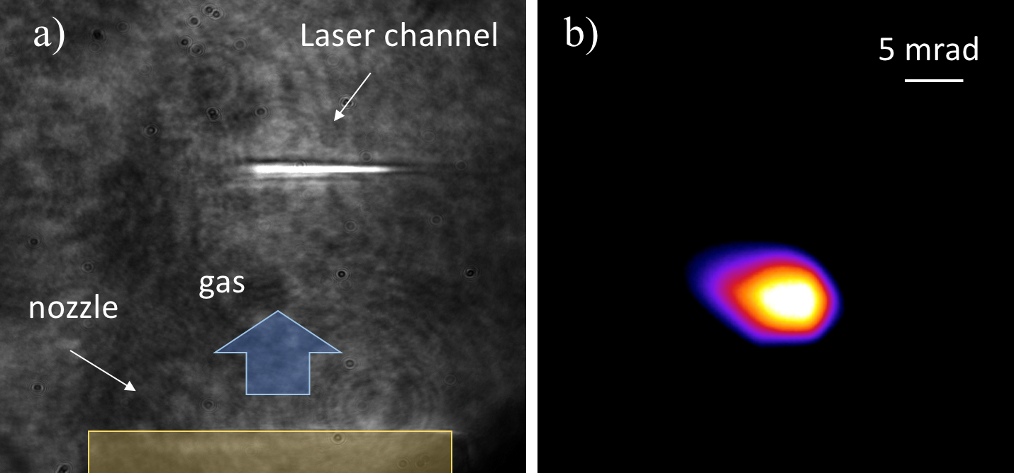 Figure 6: a) Shadowgraphy signal (side view diagnostic) of the channel created by the laser at about 10 ps from the beginning of the interaction. b) example of a good electron beam profile, as obtained from the process of optimization of the LWFA. The optimized electron beam divergence was about 5 mrad FWHM, with pointing fluctuation of about ±5 mrad.