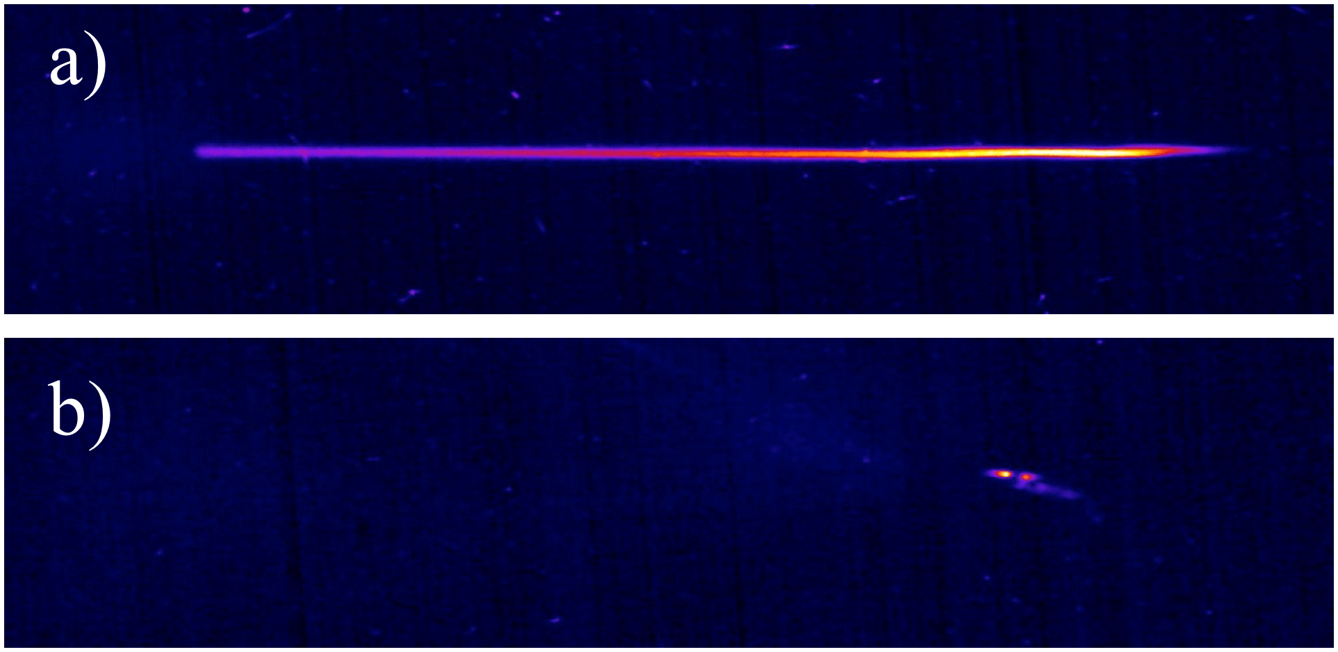 Figure 7: a) electron trace on LANEX for the case of gas admixture, and b) for the case of pure Helium gas.