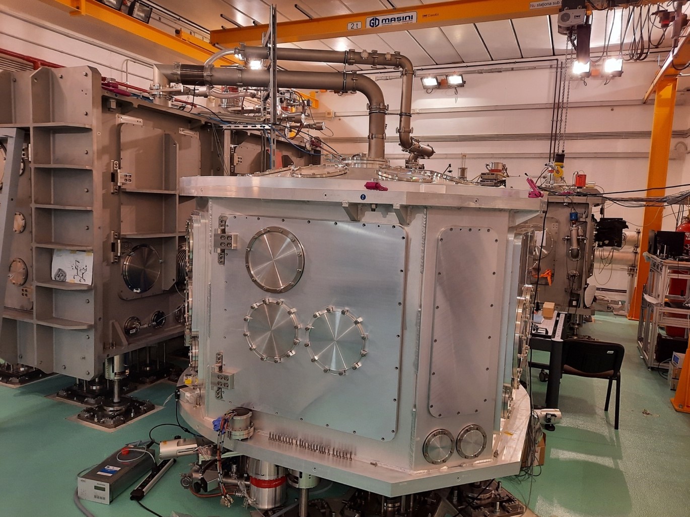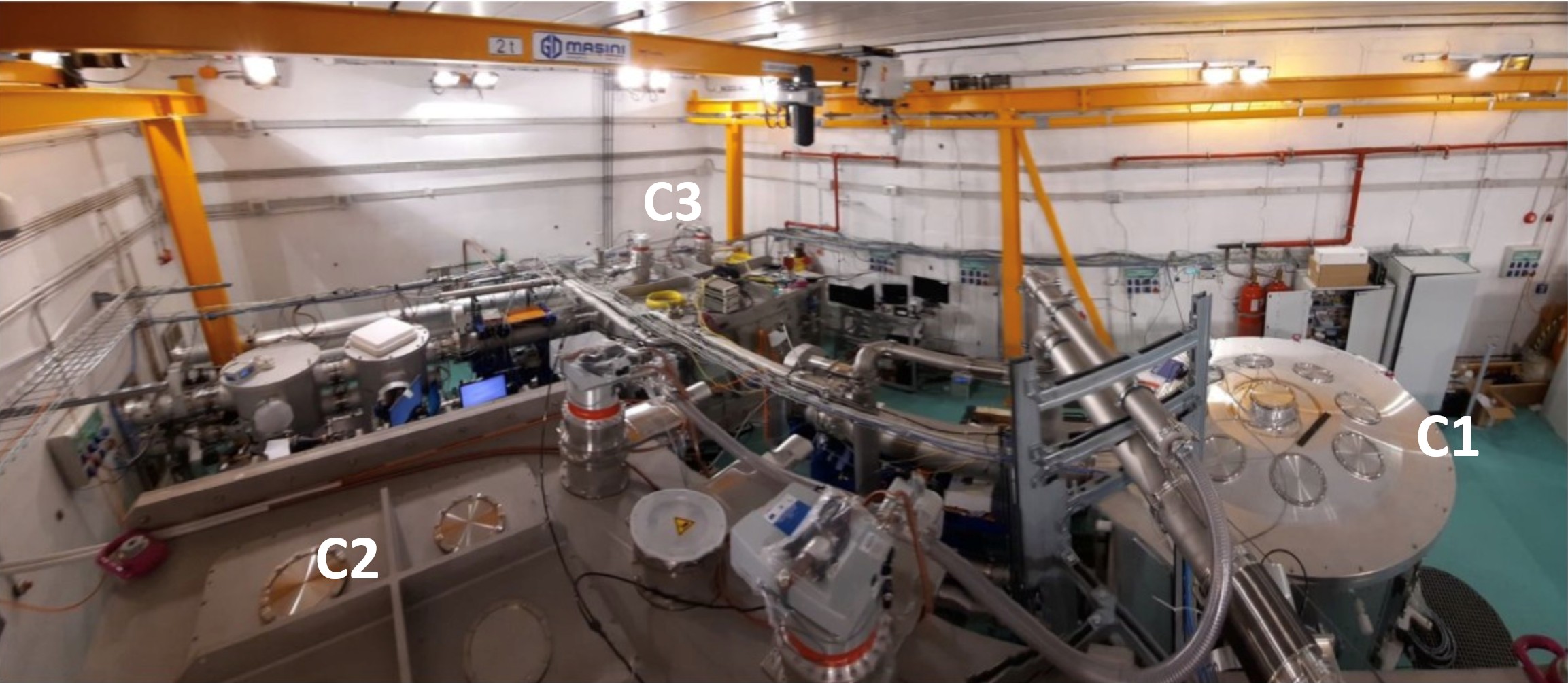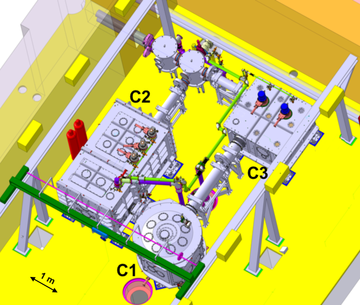 - Three large vacuum chambers have been built and installed, denominated C1, C2 and C3, along with turning boxes for the beam transport. C1 is the main interaction chamber, while the other two are used to deliver the short focal beam (C2) and the long focal beam (C3) into the interaction chamber (C1), as well as allow further setups to be installed (e.g. waveplates, laser back reflection monitoring) [D. Doria et al. 2020, K. A. Tanaka et al. 2020].