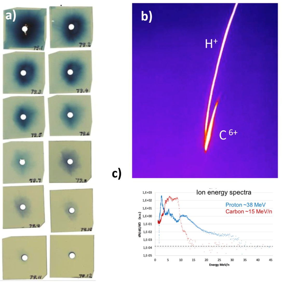 Figure 4: a) Radiochromic film stack and b) Thomson parabola signals obtained by shooting a 19 J laser beam via a plasma mirror onto a diamond-like, 380 nm thick carbon target.