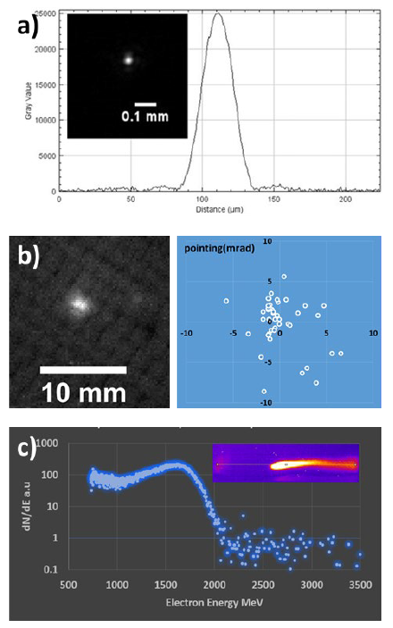 Figure 5: a) Focal spot typically obtained with the long focusing mirror; b) Electron beam divergence measured before the electron spectrometer; c) Energy obtained with a 20 mm 3D-printed gas cell.